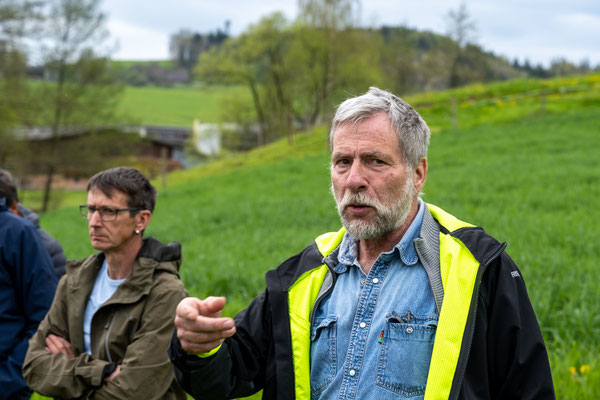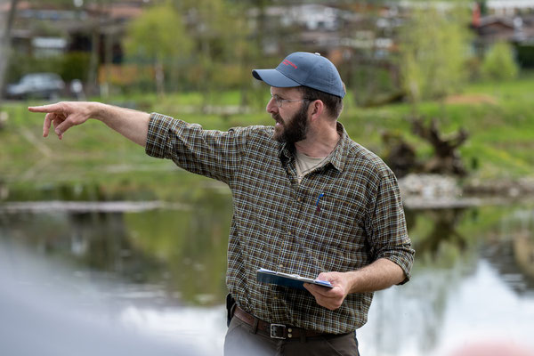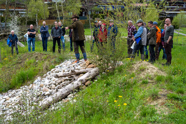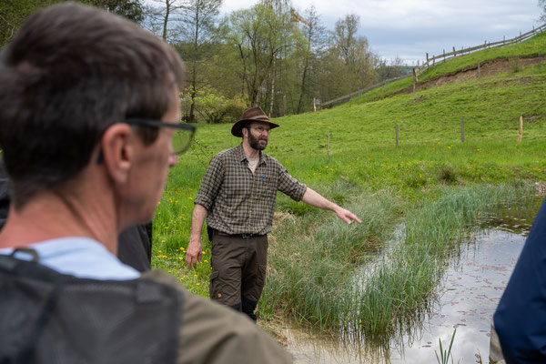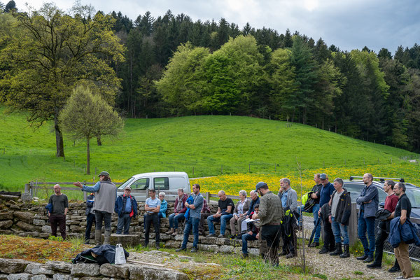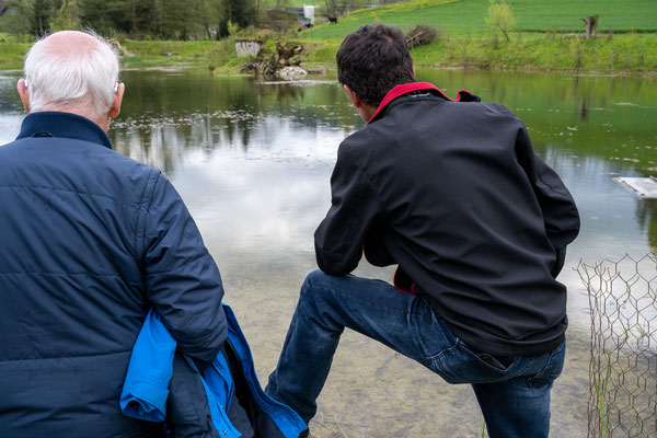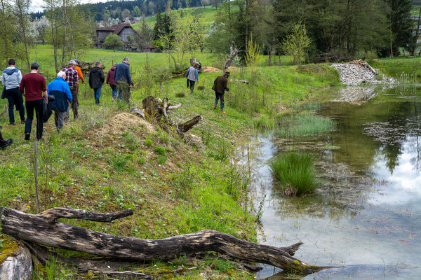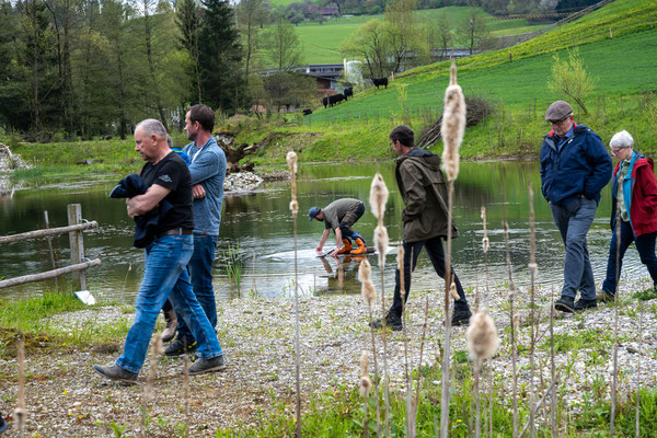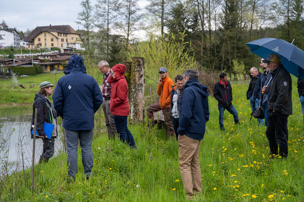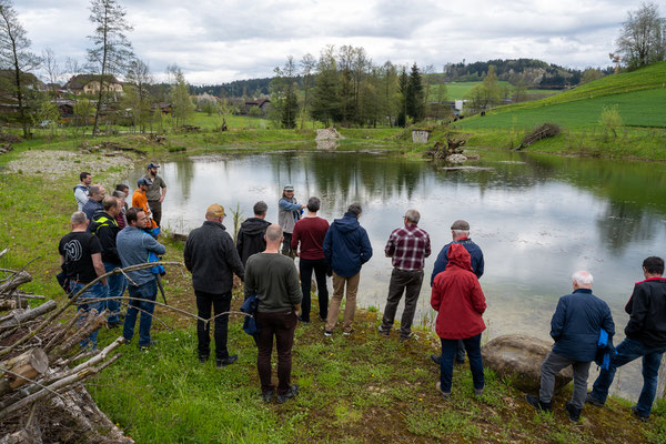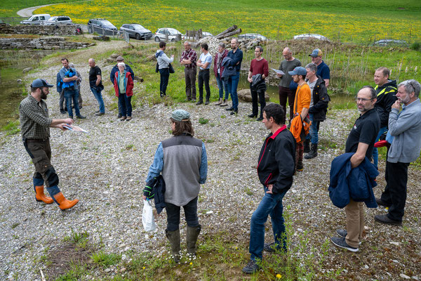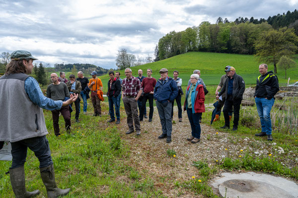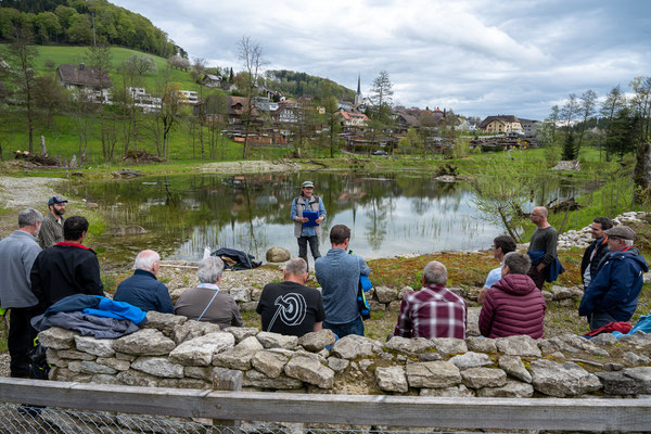 Rund 20 Leute kann Manfred Steffen als Projektleiter begrüssen. Ein kurzer Rückblick über die lange Baugeschichte macht eindrücklich klar, was es braucht, einen so grossen Teich auf möglichst naturnahe Art zu bauen. Martin Hafner als Bauleiter schildert anschaulich die technischen Details des Baus.