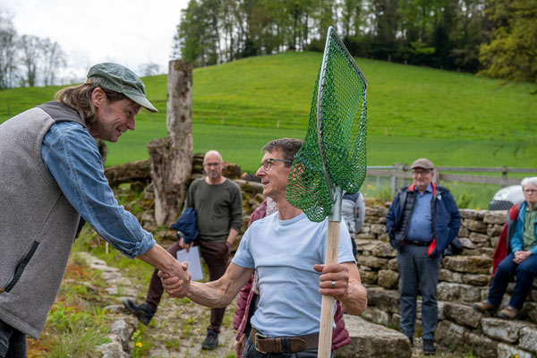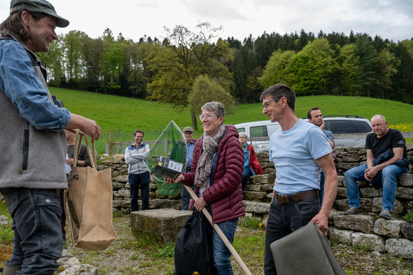 Neben einem Dank an alle Beteiligten, von den Behörden über die Bauleute zu den Geldgebern gilt ein besonderer Dank den beiden Besitzern des Geländes, Dorli und Elmar Steffen. Für sie war es nicht immer einfach, sie mussten auch einige Anfeindungen ertragen. Die Geschenke Feumer, Feldstecher und Fotobuch sollen Dorli und Elmar bei der Pflege und Beobachtung des Weihers unterstützen.
