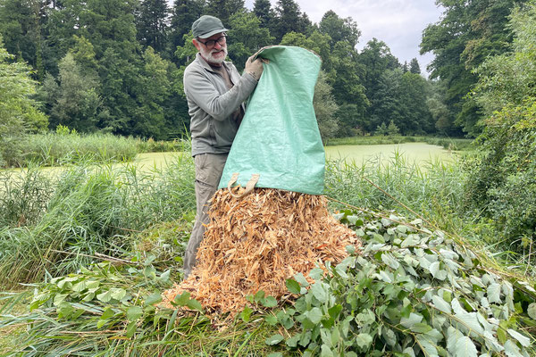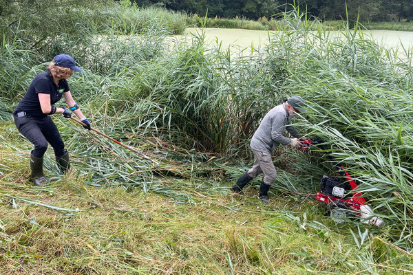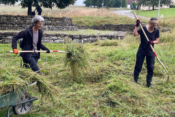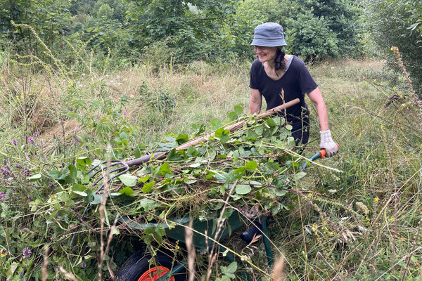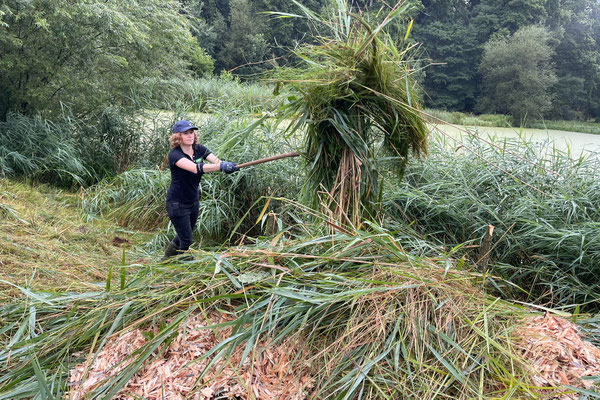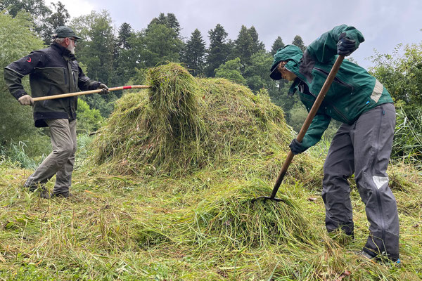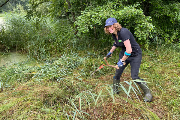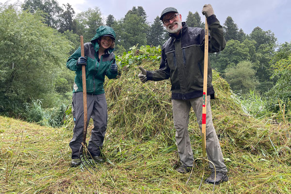 Bei grossem Wetterglück – der Regen setzte bis am Mittag aus – wurde von der Pflegegruppe Trübelbachtal der ganze Samstagvormittag fleissig zu gunsten grosser Pflanzenvielfalt, Ringelnattern, Gelbbauchunken und vieler weiterer Bewohner gearbeitet. Bei der Rottaler Tanzlinde wurde gemäht und gejätet. Am Trübelbachweiher wurden Unkentümpel ausgemäht sowie Brombeeren ausgegraben, um dem Bestand des Grossen Wiesenknopfs wieder mehr Licht zu verschaffen. Ein Teil der Riedwiese und Hochtstaudensäume um den Weiher wurden zurückgeschnitten. So gab es unterschiedliches Schnittgut, das in einem guten Mix wechselweise auf einem Haufen geschichtet werden konnte. Zusätzlich wurde dieses Material mit Ästen und Holzschnitzeln ergänzt. Für die stark gefährdete Ringelnatter entstand dadurch ein weiterer optimaler Eiablageplatz. Die Helferinnen wurden mit einem feinen Znüni belohnt sowie tollen Beobachtungen. Gar eine junge Ringelnatter gehörte zu den Entdeckungen, aber auch viele andere Tiere und schöne Blumen. Wir freuen uns, wenn du beim nächsten Einsatz in diesem idyllischen Gebiet mithilfst. Melde dein Interesse bitte bei Patrick Zemp (079 341 87 00) oder unter verein@lebendigesrottal.ch