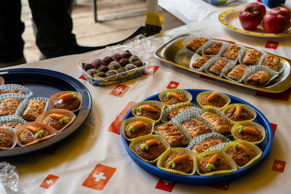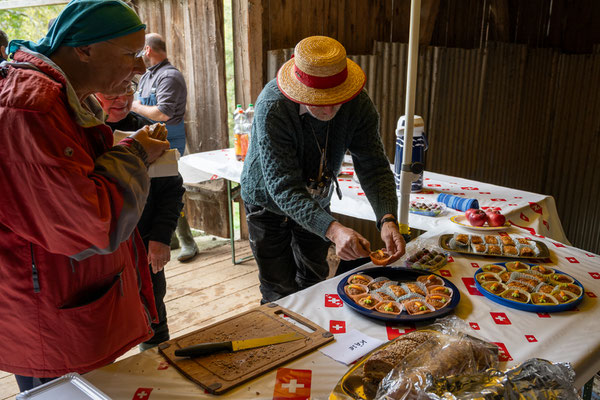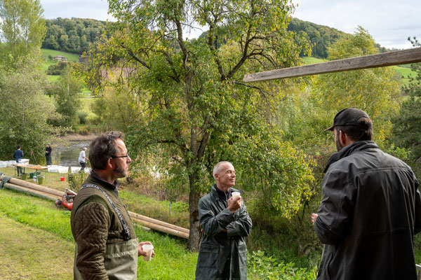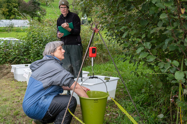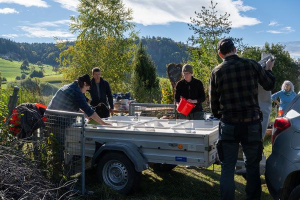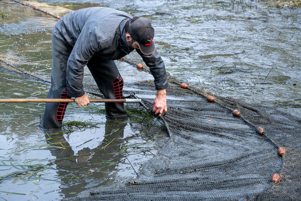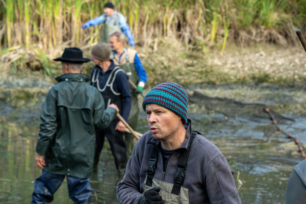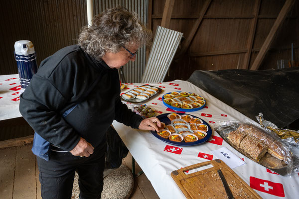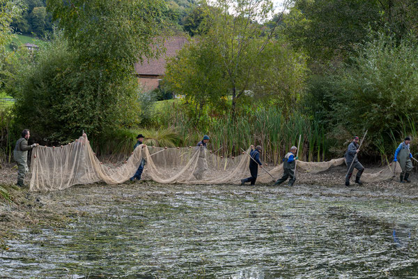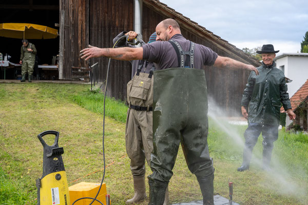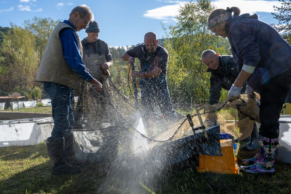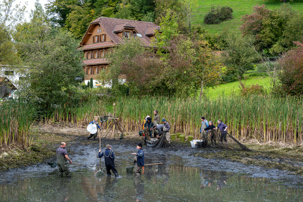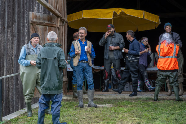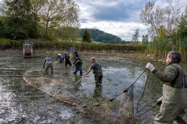 Überhaupt: Bernadette und Bruno Schaller haben alles gegeben um ein erfolgreiches Abfischen durchführen zu können: Ein freundlicher Empfang, alle notwendigen technischen Einrichtungen, ein nicht allzu sumpfiger Teich, in dem sich sogar der Fotograf mit seinen kurzen Stiefeln bewegen konnte und nach getaner Arbeit ein feiner Znüni, im Tenn wunderschön präsentiert