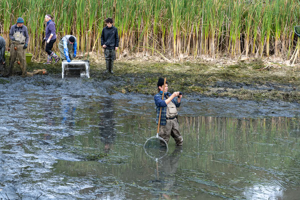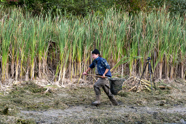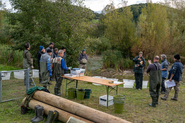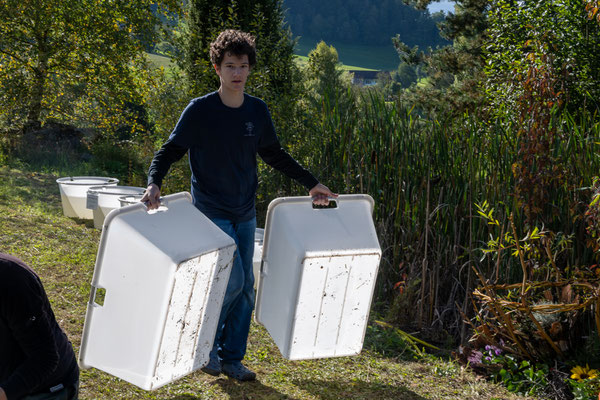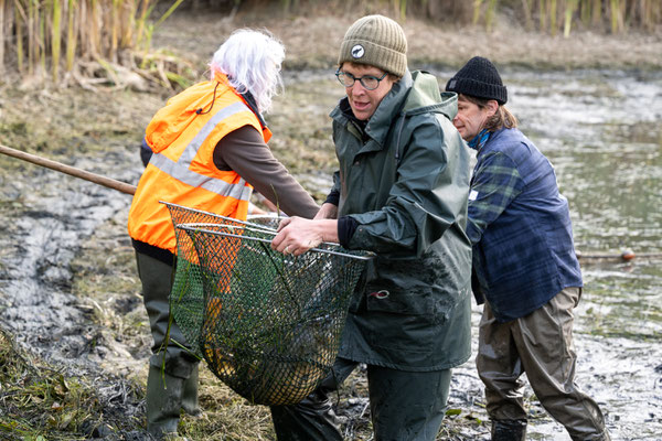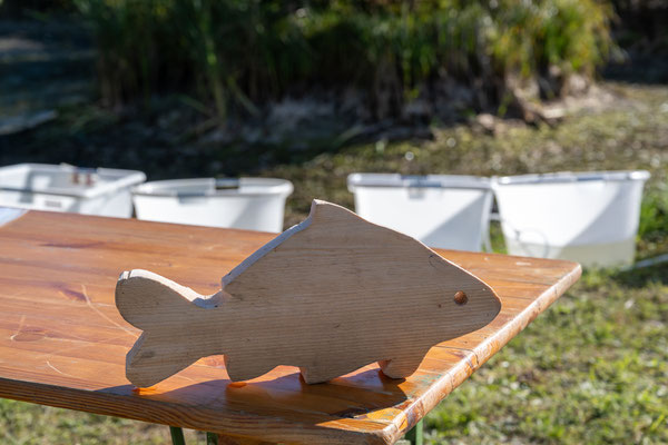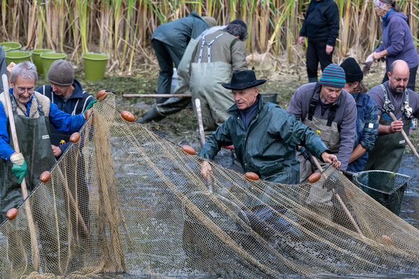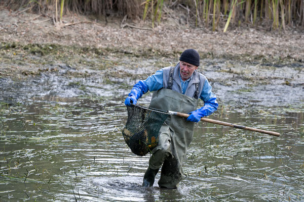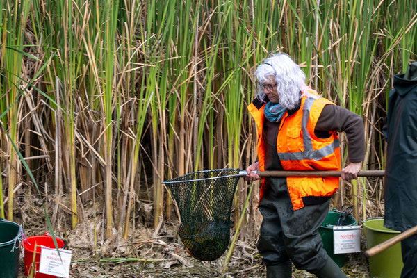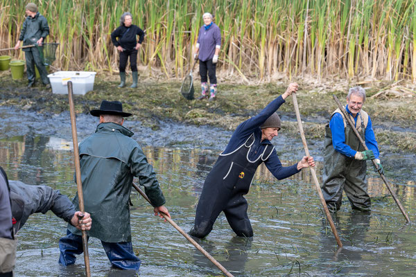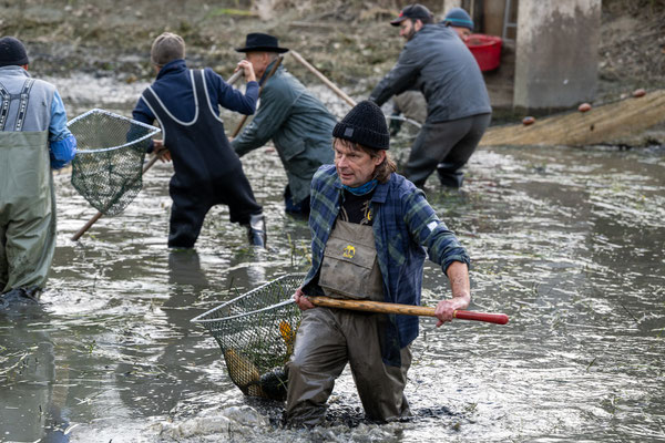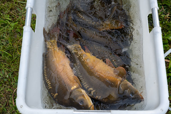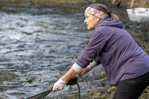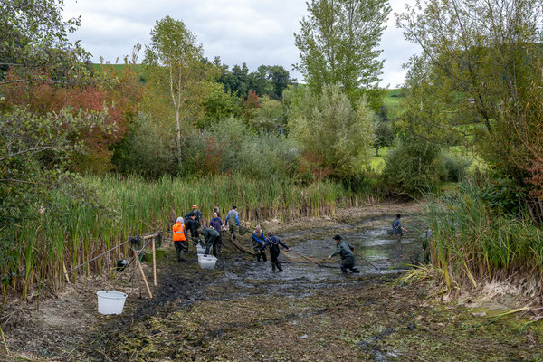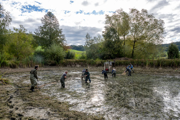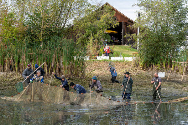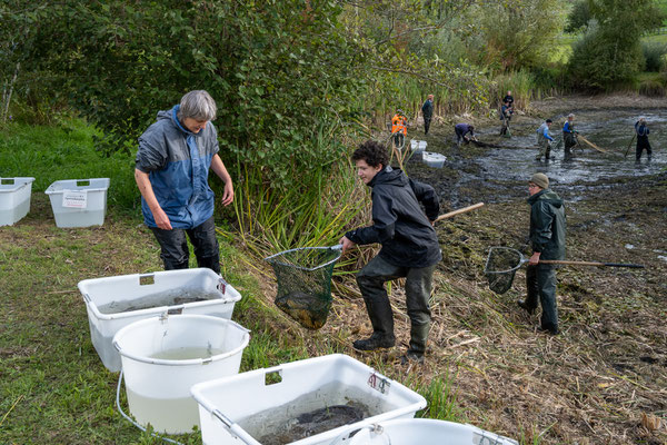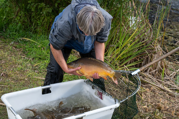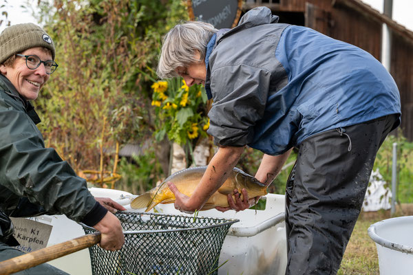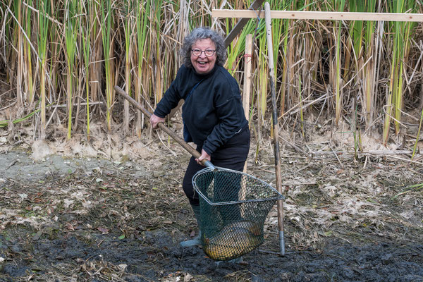 Maria Jakober, Karin Schneider und Manfred Steffen leiteten die Arbeit souverän, so dass die gut dreissig grossen Karpfen mit zweimaligem Netzdurchzug und einigen Spezialübungen schon bald sicher an Land gebracht waren und gewogen und abtransportiert werden konnten.